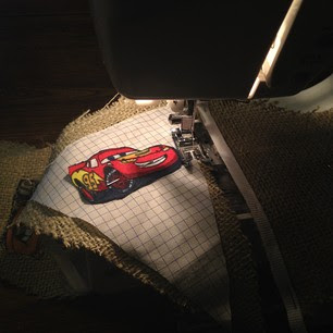 Fabric of your choice- I used burlap, I love the natural look to it. I used old dress shirt of my husband and left over ligthening McQueen and Mater fabric from pajama pants